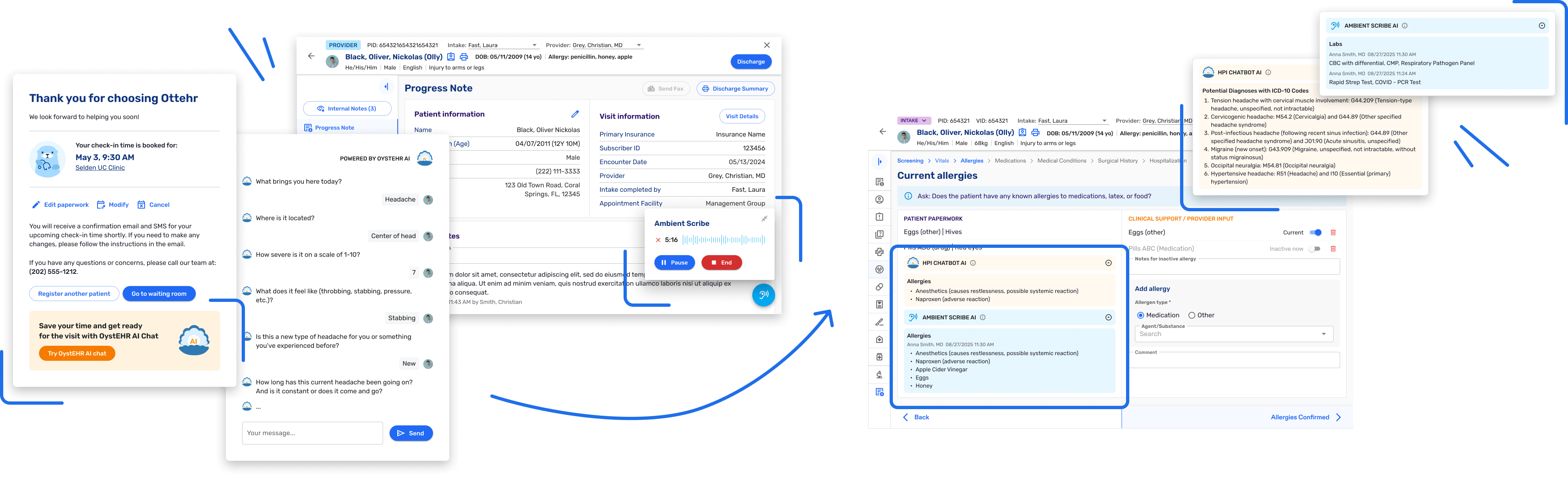 Enhance clinical efficiency with our suite of AI solutions. Our AI HPI and medical history chatbot, AI ambient scribe and encounter documentation, and AI coding assistant work together to help clinics manage patients faster, ensure accurate records, and enhance the patient experience.
